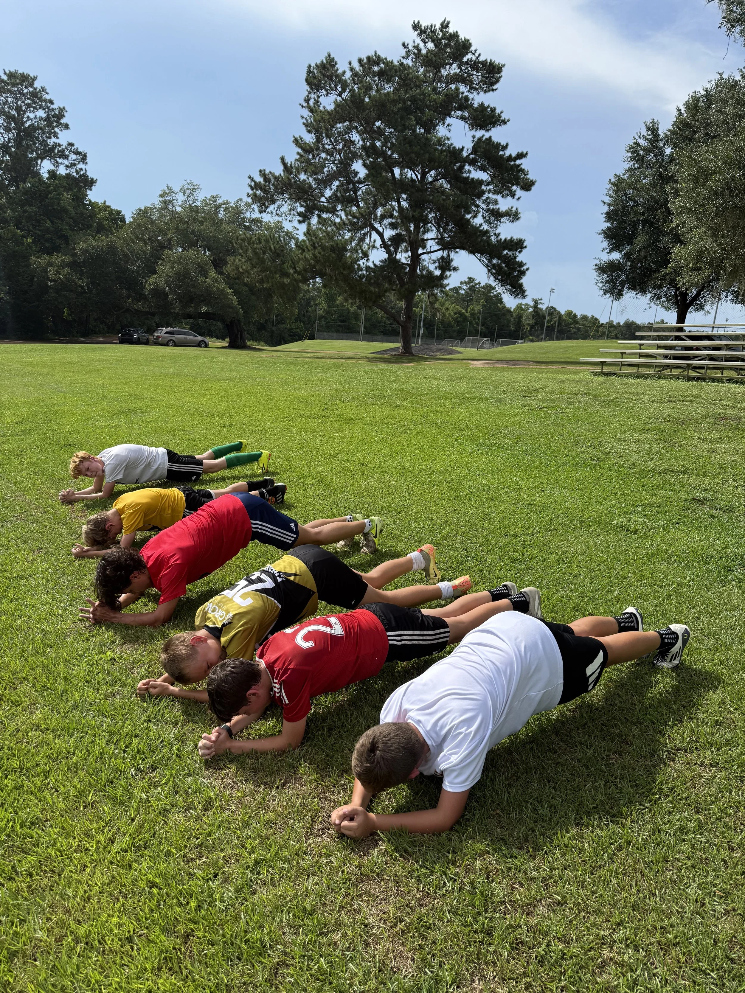 Deceleration and Acceleration Exercises: Various cone layout, pole layout, and coach to players cues to sprint in short/long burst in different direction. Keeping players on their toes to best simulate game situations. Improving acceleration, decceleration, along with change of direction.
