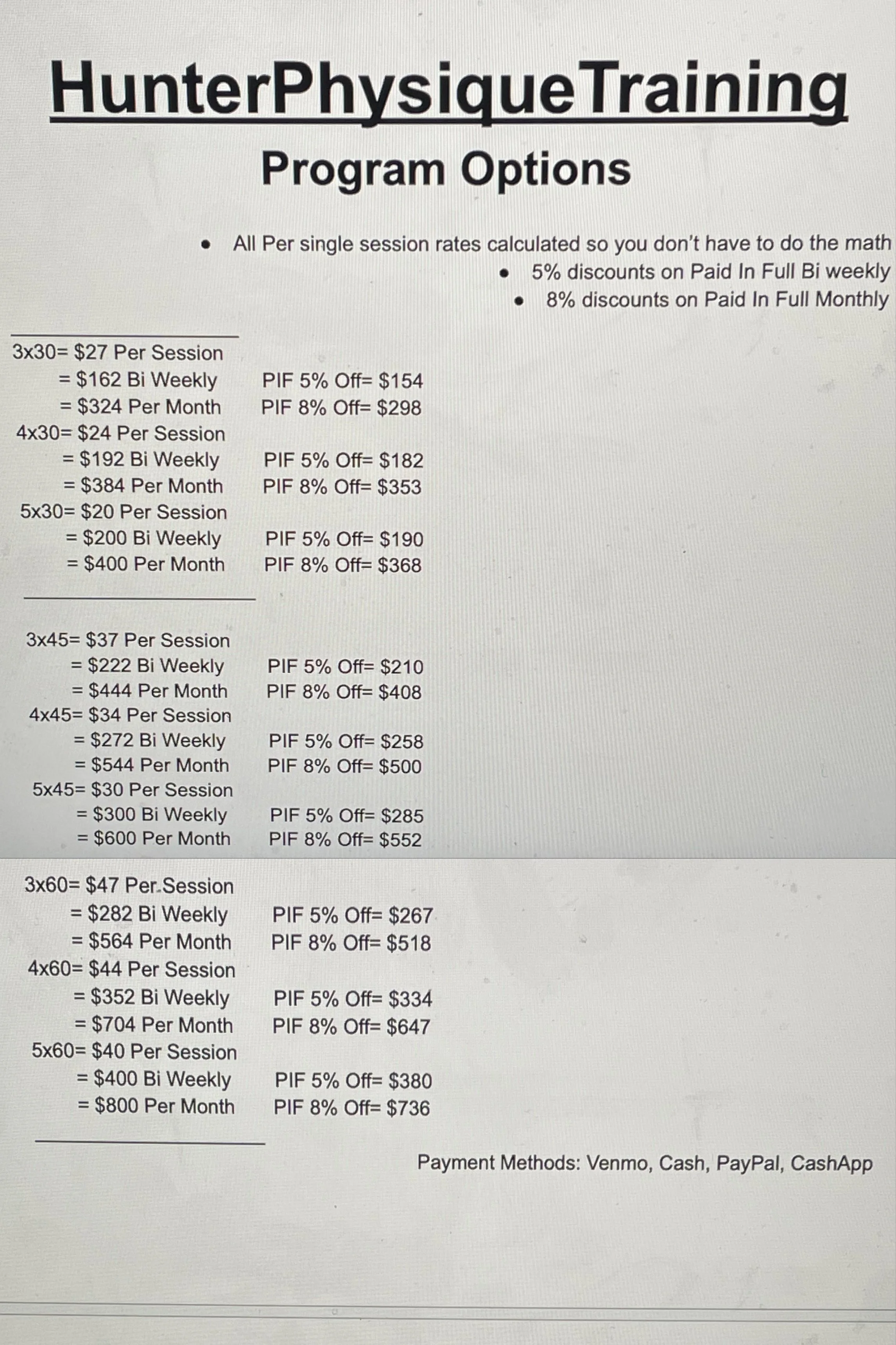All Bi Weekly Paid in Full sessions will have a 5% discount. For example, as opposed to paying for 4 45 minute sessions per session for 2 weeks, if you choose the Bi Weekly Paid in Full option you would save 5%.